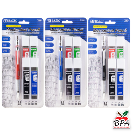 Bazic • Lápiz mecánico para dibujo 2.0mm (Incluye sets de minas: HB, 2B, 4B Y 6B)
